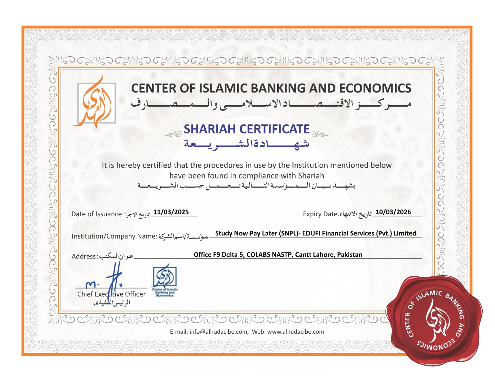 AlHuda Center of Islamic Banking & Economics (CIBE) has developed for us a Shariah Compliant Study Now Pay Later Education Facility on the basis of Service Ijarah.